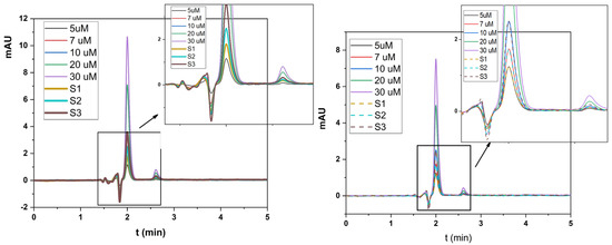 The investigative constancy of the modified electrode was tested using a developed method for the detection of MORPH in the urine samples. Samples were taken from apparently healthy volunteers and directly tested. The accuracy of the method was validated with the high-performance liquid chromatography analysis (Thermo Scientific UltiMate 3000 HPLC with a diode array detector) based on the method proposed by Fernandez et al. [29]. Results obtained from HPLC measurements at wavelengths 250 and 283 nm are given in Figure 8. The sample volume of 1 mL was diluted three times with the supporting electrolyte and analyzed. The dilution was chosen according to literature data, where it was stated that the concentration of morphine in urine is up to 26 µm, several times lower than in blood samples (up to 100 µM) [30], so that a sample that was diluted three times would be in the lower limit of the linear range of the method [31,32]. Primarily, urine samples with no added standard solution of MORPH had been tested and no current response was found. Then the analyses proceeded with the addition of distinct quantities of MORPH into the urine samples, which eventually showed a characteristic anodic peak. The experimental conditions were the same as those in which all the above experiments had been performed. Results are summarized in Table 2. The obtained results and recovery values in the range from 99% to 101%, and good agreement with the reference HPLC method, indicate that the proposed sensor can be used as an excellent platform for monitoring MORPH content in the biological fluids with no or negligible matrix effect. The proposed approach can serve as the excellent basis for the further miniaturization of the method and for potential transfer from laboratory application to commercial use.