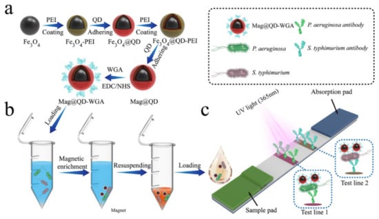 Tu, Z.; Yang, X.; Dong, H.; Yu, Q.; Zheng, S.; Cheng, X.; Wang, C.; Rong, Z.; Wang, S. Ultrasensitive Fluorescence Lateral Flow Assay for Simultaneous Detection of Pseudomonas aeruginosa and Salmonella typhimurium via Wheat Germ Agglutinin-Functionalized Magnetic Quantum Dot Nanoprobe. Biosensors 2022, 12, 942. https://doi.org/10.3390/bios12110942