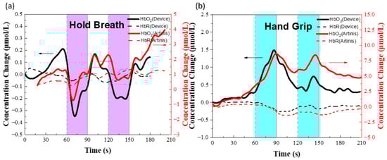 To verify that the device measures changes in hemoglobin concentration in the prefrontal lobe (hairless area) accurately, the device was attached to the prefrontal cortex of the subject’s brain. The Valsalva test is a physiological test commonly used to non-invasively evaluate the regulation of cerebral blood flow by increasing intrapleural pressure to reduce the return of blood from the veins to the heart, thereby altering the body’s normal blood circulation [28]. Healthy adult subjects were asked to complete normal breathing for 60 s, hold their breath for 30 s and repeat twice. Before each breath hold, the subject was asked to take a deep breath. The results of the relative changes in ΔHbO2 and ΔHbR in the prefrontal cortex are calculated from all raw intensity measurements as shown in Figure 5a. The experiment begins with the subject breathing normally and the changes in ΔHbO2 and ΔHbR concentrations are insignificant, fluctuating up and down by less than 0.2 μmol/L. When the subject inhales deeply to increase the internal thoracic pressure and then holds his breath, the oxyhemoglobin concentration decreases rapidly and tends to continue to rise during the breath-holding period. The amount of change in both concentrations decreases and then rises to bulge a small packet when the test subject resumes normal breathing. The whole trend of change is consistent with available physiological studies [29,30,31]. To demonstrate that the results of the device testing are not coincidental, a second set of experiments was set up, again by attaching the device to the prefrontal cortex region of the subject’s brain.