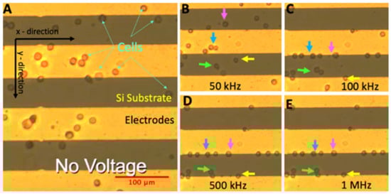 Prior to loading the glioma cells into DEP device, we sterilized the device using 70% isopropyl alcohol and rinsed the device with deionized water and the DEP buffer, respectively [,]. In addition, we used the DEP buffer to remove bubbles from the electrode array. The experiment was initiated by loading 40 μL of cell suspension (6 × 105 cells/mL) in the microelectrode array using a 200-µL pipette. DEP experiments were performed without fluid flow (there was no drag force in the device). The movement of the glioma cells was generated by dielectrophoretic forces in the DEP device. When there was no cell flow in the electrode array (due to pressure differences in the inlet and outlet ports), we applied 3 Vpp, 30 kHz signal and acquired the images of the cells at 5 frames/second. We performed the experiments in 30 min. Figure 3A illustrates the acquired micrograph of the electrode array with glioma cells in the absence of an electric field, Figure 3. Movement of the glioma cells was demonstrated in Figure 3B,E when 3 Vpp, 50 kHz (Figure 3B), 100 kHz (Figure 3C), 500 kHz (Figure 3D), and 1 MHz (Figure 3E) were applied. The experiments were performed at least in triplicate.