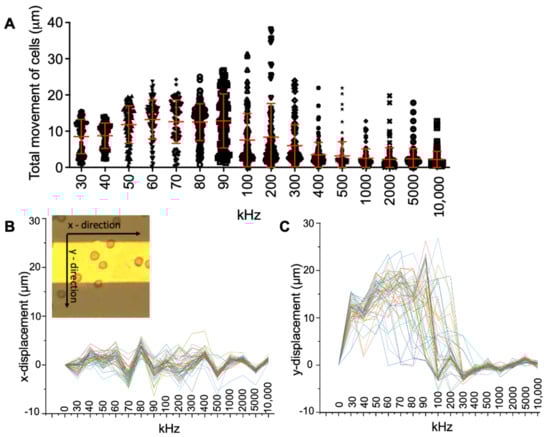 Figure 4A illustrates the distributions of total displacements of glioma cells for each frequency with means and standard deviations. The initial positions of the cells were normalized to zero in Figure 4B,C. We observed that U87 glioma cells exhibited crossover frequency around 100–200 kHz []. The heterogeneity of U87 glioma cells was not visible upon the crossover frequency region since all the cells were strongly attracted by electrodes. However, the distribution of dielectrophoretic displacement was wider around crossover frequency (90–300 kHz). The distribution of the glioma distances was not uniform at 200 kHz, Figure 4A–C displays the movement of 100 glioma cells according to their dielectrophoretic responses along the x-axis and y-axis (inset in Figure 4B), respectively. Next, we calculated the dielectrophoretic deformation indexes of U87 glioma cells using Equation (6), where π is 3.14 [,,,].
