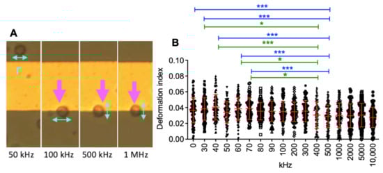 Dielectrophoretic deformation of U87 glioma cells. (A) Deformation of a cell at 3 Vpp–50 kHz, 100 kHz, 500 kHz, and 1 MHz, (B) Deformation indexes of cells at 0 kHz–0 Vpp, and 3 Vpp–30 kHz to 10 MHz. One-way analysis of variance test was applied. n = 100 cells, * = p < 0.05, *** = p < 0.001.