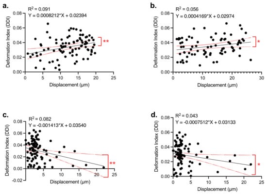 Linear regression between the deformation indexes and displacements of U87 glioma cells. When 3 Vpp and (a) 50 kHz, (b) 90 kHz, (c) 400 kHz, and (d) 500 kHz electric field was applied. Simple linear regression test was applied. n =100 cells at each frequency, * = p < 0.05, ** = p < 0.01.