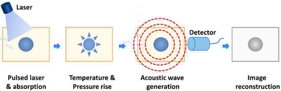 The first photoacoustic (PA) effect was described by Alexander Graham Bell in 1880 [6]. In following studies, Lloyd Barton Kreuzer pushed the limits of high peak power and high spectral purity of pulsed lasers in 1971, which facilitated the imaging application of PA [7]. Subsequently, PAI attracted increasing attention in a spectrum of biomedical fields, especially in disease theranostic applications [8,9]. PAI, an emerging biomedical imaging technology, capitalizes on a wide range of endogenous chromophores and exogenous PA contrast agents to offer functional and molecular information related to diseased tissues [4]. As shown in Figure 1 of the general principle of PAI, PA effect is a process of generating acoustic waves which result from absorbed optical energy under a nano-second pulsed laser [2]. PAI leverages the PA effect to acquire detailed real-time information of the cellular and molecular signatures of biological tissues. Specifically, after absorbing laser energy, endogenous and exogenous contrast agents attributed to the transient expansion of biological tissues due to the temperature increase and such temperature changes lead to the generation of ultrasound waves. Afterwards, the ultrasound transducer was used to measure as well as process the acoustic waves and form an image [10].