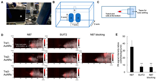 Photoacoustic equipment and PA signals after Tra-AuNRs incubation with HER2 positive and negative cells. (a) Light illuminator and ultrasound-wave receiver, (b) A sample tube with cells at its bottom was hung over the water tank. (A) Instrument of the PA imaging; (B,C) Corresponding diagrams of the instrument; (D) In vitro PA imaging study of Tra1-, Tra2-, and Tra3-AuNRs using both N87 and SUIT2 cells after 6 h of incubation; (E) PA signal intensity ratios of Tra2-AuNRs-added cell samples, ** p < 0.01. Reproduced with permission from Ref. [27] Copyright 2020, J-STAGE.
