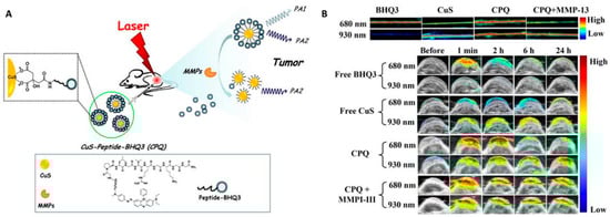 Matrix metalloproteinases (MMPs) contribute to degrading proteins in the extracellular matrix (ECM) and thus have a positive effect on the treatment of a variety of diseases [42]. In 2013, a smart activatable PAI probe was developed by Yang et al. for the detection and visualization of MMP activity in vivo [43]. As shown in Figure 5, the probe was designed by attaching a black hole quencher 3 (BHQ3) linked peptide on the surface of CuS nanoparticle. The probe showed two absorptions at 680 and 930 nm (PA680 and PA930, respectively). In the presence of MMPs, the cleavage of the peptide led to the release of CuS nanoparticles and BHQ3 molecules. The PA680 was quickly diminished while that of PA930 was largely retained, allowing ratiometric PAI of tumor tissues.