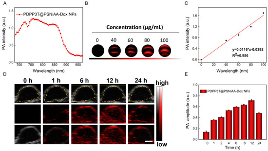 PA properties of PDPP3T@PSNiAA−Dox NPs in vitro and vivo. (A) PA spectrum of PDPP3T@PSNiAA−Dox NPs; (B) The PA images of PDPP3T@PSNiAA−Dox NPs at various concentrations in low−PA−density tubes; (C) The relationship of PA intensity and concentration of PDPP3T@PSNiAA−Dox NPs; (D) In vivo PA images and intensity of PDPP3T@PSNiAA−Dox NPs; (E) In vivo PA signal of PDPP3T@PSNiAA−Dox NPs in tumor area as a function of postinjection time. The scale bars of all images are 2 mm. Reproduced with permission from Ref. [50] Copyright 2019, Elsevier.