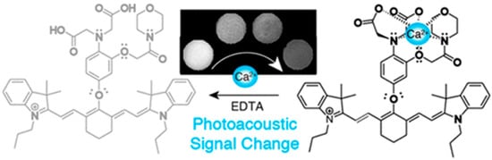 For “on-off” PA probes, the interaction between probes and biomarkers in target tissues reduces probes’ light absorption and leads to the decrease in PA signals [75]. Divalent cations play crucial roles in a wide range of biological activities in body, such as DNA and myelin synthesis, redox processes, and oxygen transportation. Calcium (Ca2+) is available for central synaptic transmission, muscle contraction, apoptosis, and inhibiting the proliferation of cancer cells [76]. To determine Ca2+, Mishra et al. reported an “on-off” NIR-PA probe L which was composed of heptamethine cyanine dye (IR-780) and a Ca2+-responsive chelator (Figure 8) [77]. When reacting with Ca2+, the absorbance at 765 nm of this NIR-PA probe L demonstrated a significant decrease, leading to the obvious change in PA signals from “on” to “off”.