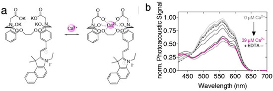 In another work, Roberts and co-workers coupled Ca2+ chelator BAPTA with fura-2 chromophore as the probe (CaSPA) for PA detection and imaging of Ca2+ [78]. With the increase in Ca2+ level, a blue shift of the absorption spectra was observed, resulting in the decrease in PA signals (Figure 9). Moreover, the experiments implied that CaSPA was highly applicable for the live imaging of Ca2+ in cells and the zebrafish brain by the combination of PAI and fluorescence.