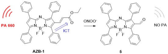 In 2021, Ma and co-workers introduced an unsaturated ketone group at 2-position of aza-BODIPY to synthesize the AZB-1 for ONOO- detection and imaging in vivo (Figure 10) [79]. Such probe had strong PA signals at 660 nm, but the reaction between AZB-1 and ONOO- led to the break of AZB-1 conjugated system, resulting in an “on-off” PA response to ONOO-. The application of this probe was then demonstrated by PAI of ONOO- generation in rheumatoid arthritis (RA), in which the mice model was established by injecting λ-carrageenan [80]. The imaging results show that the PA signal at the RA limb was about 3 times lower than that of the normal limb, suggesting the potential of AZB-1 for imaging of ONOO- generation in vivo.