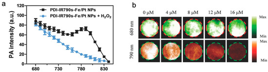 ROS, such as hydrogen peroxide (H2O2), superoxide anion (O2•−), and hypochlorous acid (HOCl), are normal by-products of numerous cellular processes, are often associated with cancer cell homeostasis [81,82]. To determine the concentration of ROS and regulate the ROS concentration for treatment, Yang et al. developed a ROS-responsive NP platform to treat tumors and real-time monitor the therapeutic process via PAI in 2018 [83]. The NP platform (PDI-IR790-NP) possessed two key parts, including cisplatin as the antineoplastic drug to trigger the increase in ROS level and perylene-diimide (PDI) and IR790s to generate PA signals. Among them, IR790s, acting as a ROS-sensitive small organic dye, was decomposed when reacting with ROS. As a result, the decrease in PA signals at 790 nm was observed for ROS determination (Figure 11).