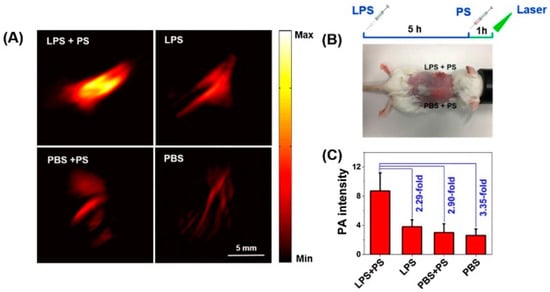 (A) In vivo PA images of detecting the NO generation induced by LPS in the inflamed mice model. (B) The locations were treated through subcutaneous injection. (C) PA intensity was acquired at 532 nm in triplicate for two sites, respectively. Reproduced with permission from Ref. [93] Copyright 2018, Elsevier.