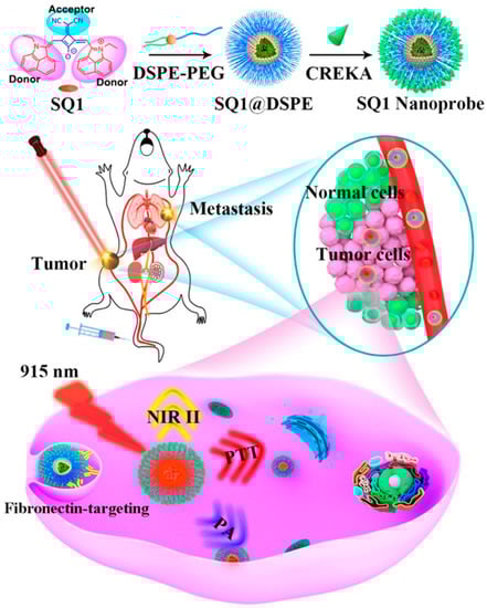 “Always on” PA probes are usually applied to the detection of biomarkers that have different concentrations in diseased and normal sites. The PA intensities of those probes keep “on” regardless of whether they succeed in interacting with the molecular of intertest or not [18]. The aza-BODIPY dye, as one of the most fascinating PAI platforms, can be modified by substituting the aryl groups on the 3 and 5 positions on phenyl rings to increase photostability and tune photophysical properties [100]. In 2020, Merkes et al. demonstrated that 1H-pyrrole conjugation to BODIPYs (PyBODIPY) can completely quench fluorescence and gain a high PA signal. The conjugation of three PEG-400 into PyBODIPY was able to adjust the water solubility, which resulted in increased blood circulation time and was beneficial to PA imaging. Such probe successfully overcame the shortcoming of BODIPY and exhibited non-phototoxic and photostable features [101]. Squaraine dyes (SQs) are a class of electron-deficient chemicals with a high molar absorption coefficient as well as excellent photoconductivity [102]. On the basis of this organic dye, Yao et al. chose to conjugate malonitrile to squaraine dye (SQ1) to improve square acid accepter and developed breast cancer and lung metastasis-double-targeting PA nanoprobe by decorating Cys-Arg-Glu-Lys-Ala (CREKA) peptide to SQ1 [103], which can indicate the overexpression of fibronectin on above-mentioned cancers (Figure 14). After injecting SQ1 nanoprobe demonstrated, robust PA signals from breast cancer (MDA-MB-231) mice models were observed, suggesting that the nanoprobes were able to effectively accumulate in tumor sites.