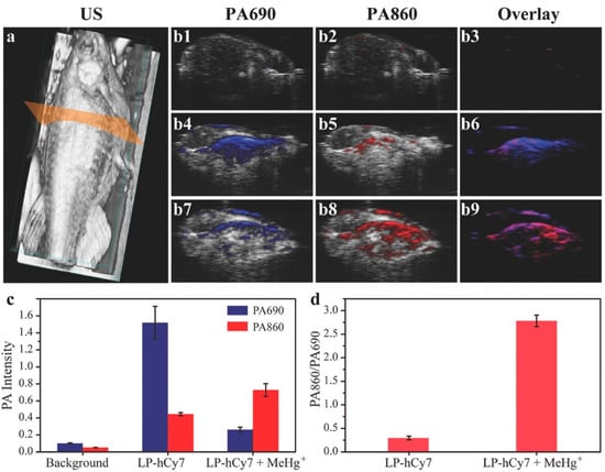 (a) 3D ultrasonic (US) image of zebrafish for illustration of PAI in transection of abdomen; (b) Merged US and PA images of untreated zebrafish (b1–b3), LP-hCy7 incubated zebrafish (b4–b6), and MeHg+/LP-hCy7 treated zebrafish (b7–b9) at 690 and 860 nm, respectively; (c) Corresponding quantified PA intensity at 690 and 860 nm for (b); (d) Ratios of PA860/PA690 obtained from (b). Reproduced with permission from Ref. [106] Copyright 2017, Wiley.