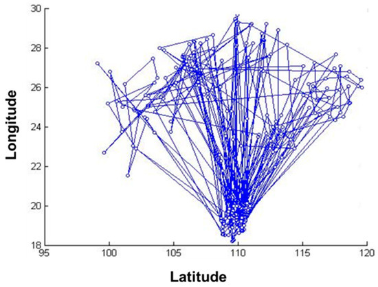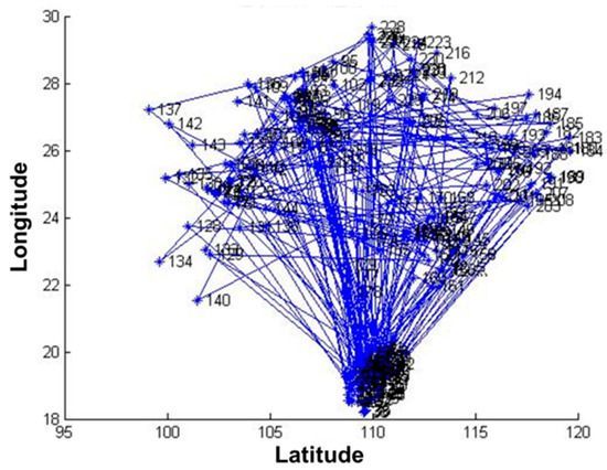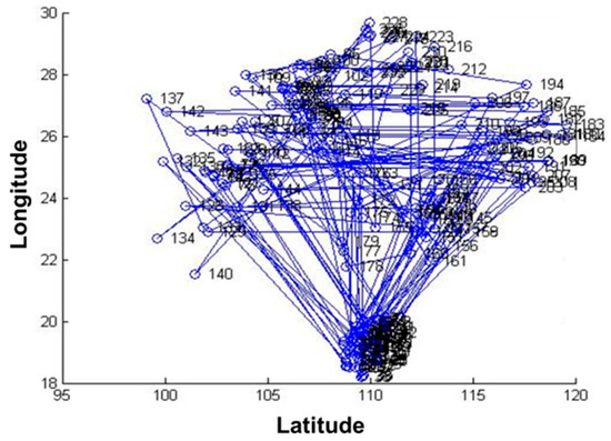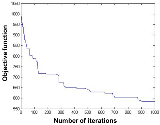 The data of 235 pest monitoring points were imported into MATLAB software (MathWorks, MA, USA), and the GA was used for optimization analysis, and the results are shown in Figure 4 and Figure 5. In order to test whether the GA-based pest monitoring data reached the global minimum, the total number of iterations was set to 1000. The value of the objective function gradually decreased, and the number of transients of its convergence trajectory increases with the increase in the number of iterations, resulting in many local minima, which reach the global minimum at about 900 iterations.