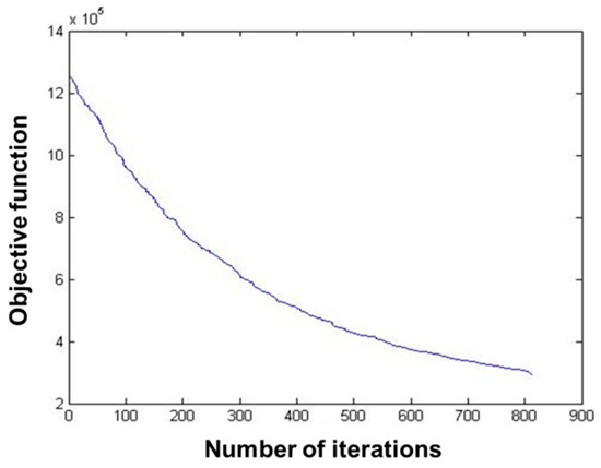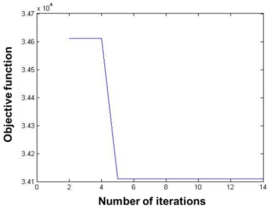 The data of 235 pest monitoring points were imported into MATLAB software, and the PSO was used for optimization analysis, and the results are shown in Figure 6 and Figure 7. The total number of iterations was set to 14, and the value of the objective function decreased with the increase in the number of iterations, and its convergence trajectory started to converge rapidly at the number of iterations of four, and reached the global minimum at about five iterations.