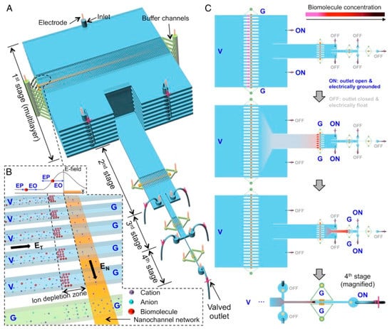 Principle of HOLMES. (A) Schematic of HOLMES with hierarchical multistages. At each stage, parallel microchannels and buffer channels are bridged by a thin nanochannel network patterned on the bottom of the microchannels. (B) Schematic of nanofluidic biomolecule concentration in massively parallel channels. Under the electrical configuration shown, biomolecules are electro-osmotically injected into the parallel channels and electrokinetically concentrated in the ion depletion zones induced near the micro-nanochannel junctions. (C) Schematic of relayed reconcentration of biomolecules from massively parallel microchannels into a single microchannel to dramatically boost the concentration performance. Reprinted with permission from ref. [105].