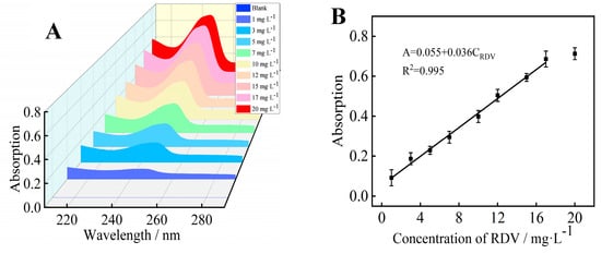 The concentration of RDV in PBS solution could be determined by UV-vis method. As shown in Figure 2A, the baseline represents the UV-vis diagram without RDV, and the concentrations of RDV added from bottom to top are 1 mg·L−1, 3 mg·L−1, 5 mg·L−1, 7 mg·L−1, 10 mg·L−1, 12 mg·L−1, 15 mg·L−1, 17 mg·L−1, and 20 mg·L−1, respectively. The absorption signal intensity at 247 nm increased with the increasing concentration of the RDV. The relationship between UV-vis intensity and RDV concentration was linear in the range of 1–20 mg·L−1, and the linear regression equation was A = 0.055 + 0.036CRDV, R2 = 0.995 (Figure 2B). The detection limit was 0.5 mg·L−1 (S/N = 3).