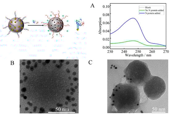 UV-vis absorption diagram of RDV concentration (A). TEM image of MSN-Au (B), and TEM image of MSN-Au after incubation with N protein (C).