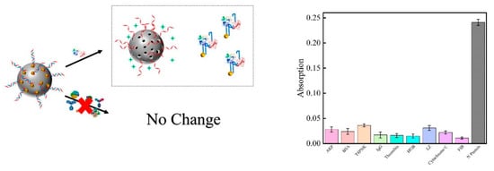 In order to verify the unique selectivity of aptamer for N protein, nine proteins commonly found in blood (AKP, BSA, T4 PNK, IgG, thrombin, HGB, LZ, cytochrome c, FIB) were selected as interfering substances. The individual interfering protein and all the interfering mixtures (Figure S7 of SI) were then reacted with MSN-Au, respectively, to evaluate the effect of aptamer on the selective delivery process. Figure 4 shows the UV-vis absorption peak at 247 nm after the MSN-Au solutions were incubated with AKP (20 U∙mL−1), BSA (2 μM), T4 PNK (20 U∙mL−1), IgG (2 μM), thrombin (2 μM), HGB (2 μM), LZ (2 μM), cytochrome C (2 μM), FIB (2 μM), and N protein (2 μM). Compared with 2 μM N protein, the absorption peak signal obtained on the UV-vis when challenged with the nine interferences were 11.62%, 9.96%, 14.94%, 7.05%, 6.64%, 6.22%, 12.86%, 9.13%, and 4.56%, respectively.