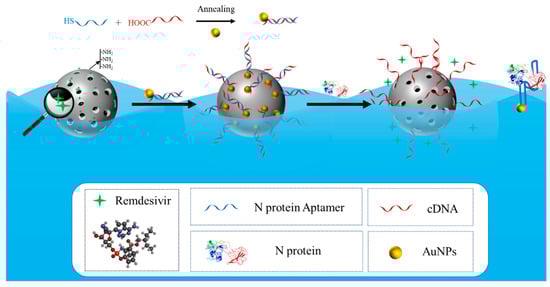 Cetyltrimethylammonium bromide (CTAB), fluorescent amine, and tetraethyl orthosilicate (TEOS) was purchased from Shanghai Aladdin Biochemical Technology Co., Ltd. (Shanghai, China). Remdesivir (RDV; 99.74%) was acquired from MedChemExpress (Monmouth Junction, NJ, USA). 3-aminopropyltriethoxysilane (APTES) and 1-(3-dimethylaminopropyl)-3-ethylcarbodiimide hydrochloride (EDC) were obtained from Shanghai McLean Biochemical Technology Co., Ltd. (Shanghai, China). N-hydroxysuccinimide (NHS), immunoglobulin G (IgG), hemoglobin (HGB), fibrinogen (FIB), cytochrome c, thrombin, and lysozyme (LZ) were acquired from Beijing Soleibo Technology Co., Ltd. (Beijing, China). Nucleocapsid protein (N protein) was purchased from Beijing Yiqiao Shenzhou Technology Co., Ltd. (Beijing, China). Gold nanoparticles were provided by Nanjing Xianfeng nano material technology Co., Ltd. (Nanjing, China). T4 polynucleotide kinase (T4 PNK) was purchased from Sangon Biotechnology Inc. (Shanghai, China). Bovine serum albumin (BSA) was acquired from Shandong sikejie Biological Co., Ltd. (Shandong, China). Alkaline phosphatase (AKP) was supplied by Shanghai Biyuntian Biological Co., Ltd. (Shanghai, China). N protein aptamers (5′-GCTGG ATGTC GCTTA CGACA ATATT CCTTA GGGGC ACCGC TACAT TGACA CATCC AGC-SH-3′) and complementary DNA (5′-COOH-TTGTA CTGGC TCATA GCTGG ATGTG TCAAT GTAGC GGTGC CCCTA AGGAA TATTG TCGTA AGCG-3′) chain were synthesized and purified by Sangon Biotechnology Inc. All the solutions were prepared with ultrapure water obtained from a Millipore water purification system (>18.2 MΩ·cm). All other chemicals were of analytical grade.