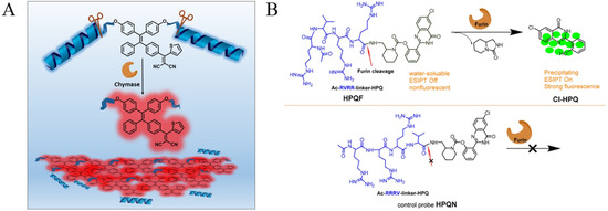 (A) Schematic illustration of the functional mechanism of the probe TPETH-2(CFTERDn). n = 2 or 3 for chymase sensing. Reprinted with permission from ref. [42]. Copyright 2016, American Chemical Society. (B) Chemical structure of the activatable probe HPQF and its working mechanism with furin (top), and the molecular design strategy of the negative control non-cleavable probe HPQN (bottom). Reprinted with permission from ref. [44]. Copyright 2018, American Chemical Society.