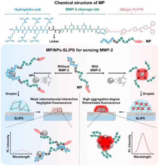 In order to improve the sensitivity of AIE-based biosensors, Wu et al. developed a two-step sensing system for protease detection based on the peptide probe of RRRRRRGGPLGLAGPra(PyTPA)-NH2 (MP), negatively charged nanoparticles (NPs) and slippery lubricant-infused porous substrates (SLIPS) (Figure 2) [45]. The water-soluble MP with an AIEgen of PyTPA showed weak fluorescence. Cleavage of MP by MMP-2 promoted the aggregation of the hydrophobic PyTPA-included residues. The aggregates were then electrostatically adsorbed onto the negatively charged NPs on SLIPS. With MMP-2 as the analytical example, the sensitivity was obviously improved in contrast to the previously reported AIE-based methods.