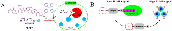Effective methods for cancer treatment largely depend on inducing the apoptosis of cancer cells through chemotherapy and/or radiotherapy. Magnetic resonance (MR) imaging is one of the frontiers of experimental and clinical radiology. It has unlimited tissue penetration depth, excellent soft tissue contrast and time–space resolution, without the use of ionizing radiation. Recently, Meade’s group reported a bimodal fluorescence–magnetic resonance (FL-MR) probe named CP1 for apoptosis imaging by monitoring the activity of caspase-3/7 (Figure 3B) [49]. The CP1 probe contains three parts: a DOTA-Gd(III) chelate for MR signal enhancement, an AIEgen of the TPE unit, and an enzyme-specific peptide, DEVD. In the presence of caspase-3/7, the water-soluble peptide DEVD was removed, and the resulting Gd(III)-AIEgen (Gad-AIE) conjugates tend to aggregate, thus inducing the increase of FL-MR signals. The dual-signal FL–MR probe was successfully used for the fluorescent imaging of cell apoptosis.