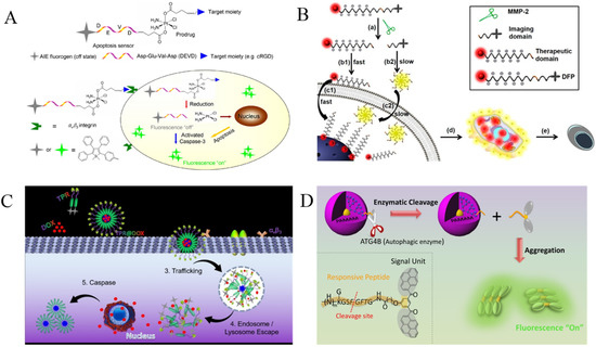 Real-time monitoring of apoptosis can provide valuable insights for the early detection of therapeutic effects and the evaluation of disease progress. Shi et al. designed an AIEgen probe for the real-time imaging of cell apoptosis by monitoring the caspase activity (Figure 3A) [46]. The probe consists of a hydrophilic caspase-specific peptide (DEVD) and a hydrophobic AIEgen of TPE unit. The water-soluble probe showed almost no fluorescence in the aqueous phase. Cleavage of the probe by caspase-3/7 led to the formation of hydrophobic TPE residues. The aggregation of TPE residues could restrict the intramolecular rotation of the TPE phenyl ring and populate the radiative decay channel, thus lighting up the fluorescence. Moreover, Ding et al. designed an AIEgen probe for the imaging of cell apoptosis by monitoring the activity of caspase-3 [47]. The probe (Ac-DEVD-TPS-cRGD) consists of a caspase-specific hydrophilic peptide (DEVD), a cell-binding cyclic peptide cRGD and an AIEgen of a tetraphenylsilole (TPS) unit. The two peptides were linked at both ends of the TPS unit. Cleavage of the probe by caspase-3 led to the release of TPS-cRGD. The aggregation of released TPS-cRGD residues lit up the fluorescence, enabling real-time imaging of cell apoptosis. Lately, Yuan et al. reported a dual-signal AIEgen probe for monitoring caspase activity. The probe (TPETH–DVEDIETD–TPS) includes three components: a hydrophilic peptide (DVEDIETD) specific to apoptosis initiator caspase-8 and effector caspase-3 and two AIEgens with green (TPS) and red (TPETH) emission colors [48]. The probe could be cleaved into a TPETH–DVEDIETD and a TPS unit by caspase-8. The product of TPETH–DVEDIETD could be further cut into a TPETH unit and DVEDIETD by caspase-3. The aggregates of TPS and TPETH emitted green and red fluorescence, respectively.