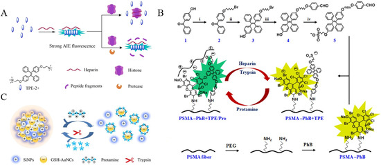 (A) Schematic illustration of the fluorometric assay for protease activity. Reprinted with permission from ref. [55]. Copyright 2018, Elsevier. (B) Synthetic route of TPE derivatives, schematic drawing of the ratiometric color changes of fibers, and grafting process of PhB on electrospun PSMA fibers. Reprinted with permission from ref. [56]. Copyright 2017, American Chemical Society. (C) Schematic illustration of the mechanism of the ratiometric detection of protamine and trypsin based on a nanohybrid probe. Reprinted with permission from ref. [57]. Copyright 2019, Elsevier.