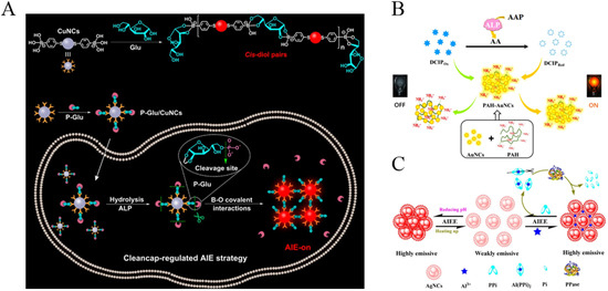 Inorganic pyrophosphatase (PPase) can catalyze the conversion of pyrophosphate (PPi) into phosphate (Pi) ions. It plays an important role in lipid synthesis and decomposition, calcium absorption, bone formation and DNA synthesis, and other biochemical transformations. With glutathione-capped silver nanoclusters (AgNCs) as the AIEgens, Tang et al. reported the assays of PPase by Al3+-triggered luminescence switch (Figure 8C) [75]. The Al3+/AgNCs aggregates showed bright red luminescence. Complexation of Al3+ by PPi but not Pi prevented the aggregation of AgNCs, while the decomposition of PPi by PPase facilitated the formation of Al3+/AgNCs aggregates. Moreover, the AIE effect of AgNCs is dependent upon the change of solution pH and temperature.