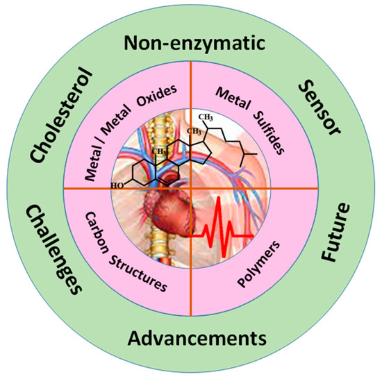 The scope of this review is to provide an overview of major advances and challenges in the development of an efficient cholesterol biosensor, as illustrated in Figure 1. We have focused on promising recent electroactive nanomaterials, such as metal/metal oxide, metal sulfides, carbon materials, and conductive polymers, which can interact with the cholesterol molecule. We have also described the current strategies for reducing interference to enhance selectivity and sensitivity. Finally, we have summarized the key challenges and issues and future prospects.