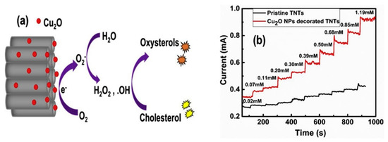 (a) Schematic representation of the oxidation of cholesterol at the surface of Cu2O NPs-TNTs electrode; (b) Amperometry of TNTs and Cu2O-decorated TNTs. Reprinted with permission from Ref. [35].