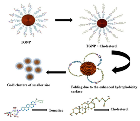 Schematic illustration for the formation of gold nanoparticles by etching of tomatine functionalized gold nanoparticles with cholesterol. Reprinted with permission from Ref. [44].