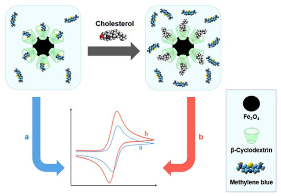 Polyoxometalate (POM) nanoclusters showing versatile structures and tunable redox properties can be considered advanced multifunctional structures for sensing applications but these materials are scarcely investigated for the detection of cholesterol. In electrochemical reactions, these materials increased the electron transfer rate, and enhanced electrochemical active surface area and sensitivity [45]. Thakur et al. reported the fabrication of a novel electrochemical biosensor based on poly(ionic liquid)–cobalt polyoxometalate supported on a carbonaceous materials composite. The electrode exhibited an excellent sensitivity of 64 µAµM−1cm−2 for the detection of cholesterol with the lowest detection limit of (1 × 10−15 M). Moreover, the electrode showed two wide linear ranges from 1 fM–200 nM and 0.5 µM–5 mM. The developed sensor also showed a good response for human blood serum samples [46]. Willyam et al. reported a non-enzymatic cholesterol biosensor based on β-cyclodextrin/Fe3O4 nanocomposite, as illustrated in Figure 4. The developed biosensor reduces the overall analysis time and simplifies the sample measurement procedures, making it suitable for practical applications. Moreover, the sensor showed excellent accuracy and good linearity in the range of 0–150 μM with a detection limit of ~2.88 μM [47].