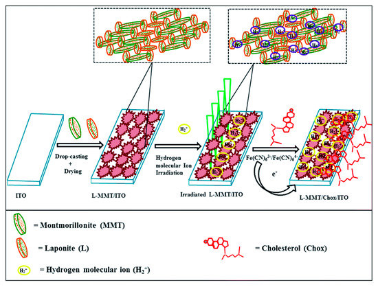 Schematic fabrication and irradiation of L-MMT/ITO film with H2+ ion beam for sensing cholesterol. Reprinted with permission from Ref. [48].