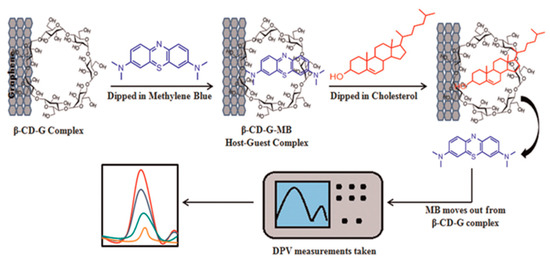 Agnihotri et al. presented a non-enzymatic approach toward cholesterol detectionusing β-cyclodextrin-functionalized graphene. This combination provided a platform for the electrochemical detection of cholesterol using methylene blue as a redox indicator, as displayed in Figure 11. The detection of cholesterol has been performed by using the differential pulse voltammetry technique [78].