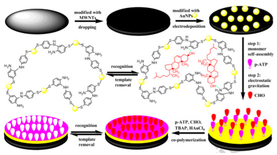 The electrochemical properties of CNTs are strongly influenced by the basal and edge plane sites, and therefore they show poor response for electrochemical signals. Ji et al. functionalized multi-walled carbon nanotubes MWCNTs with gold nanoparticles (Au NPs) and improved the conductivity [82]. To fabricate a non-enzymatic cholesterol biosensor, a molecularly-imprinted polymer membrane on a glassy carbon electrode was modified with MWNTs/Au NPs, as shown in Figure 14. It has been found that the developed sensor exhibits good sensing response in a linear range between 1 × 10−13 and 1 × 10−9 mol L−1. The sensor exhibits excellent sensitivity, good stability, and selectivity.