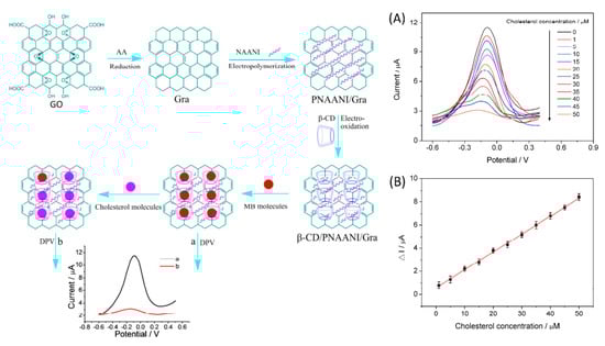 Schematic illustration of the preparation of β-cyclodextrin/poly(N-acetylaniline)/graphene-modified electrode and detection of cholesterol based on the competitive host–guest interaction between β-CD and MB (left). (A) DPV response with increasing concentration of cholesterol (A). Cholesterol measurement calibration curve (B). Reprinted with permission from Ref. [101].