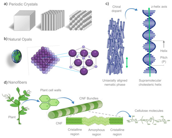 (a) One dimensional (1D), 2D, and 3D organization of photonic crystals, found in nature through the wings of several insects such as butterflies and cicadas. (b) Natural opals, an instance of periodic crystals, display a colorful aspect as a consequence of periodic systems with spheres substantially packed, which form a face-centered cubic lattice. (c) When nematic liquid crystals are doped with chiral molecules they can form supramolecular helix structures, conferring them remarkable features as diffraction grating, and selective light reflection. It is important to mention that the helix pitch is determined by the chemical structures of molecules forming the cholesteric phase, as well as the concentration of chiral moieties present in the dopant component. (d) Cellulose, the major component of cell wall plants, is organized in nanofibers (CNFs) possessing chiral nematic structures and 1D nanostructures with crystalline and amorphous regions.