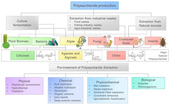 Major natural polysaccharides used in biomedical applications, highlighting their main sources, and the wide range of processes to isolate them.