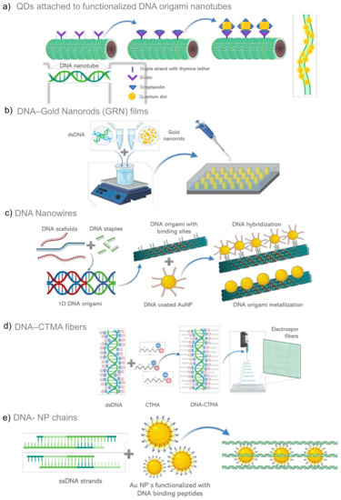 - Ongaro, A.; Griffin, F.; Beecher, P.; Nagle, L.; Iacopino, D.; Quinn, A.; Redmond, G.; Fitzmaurice, D. DNA-templated assembly of conducting gold nanowires between gold electrodes on a silicon oxide substrate. Chem. Mater. 2005, 17, 1959–1964. [Google Scholar] [CrossRef]