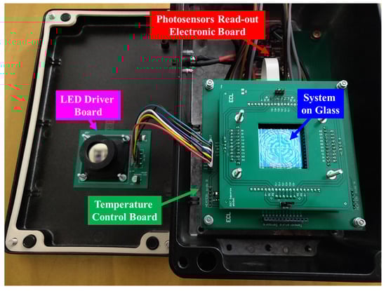 The core of the system is the Lab-on-Chip, also called System-on-Glass (SoG), which is a 5 cm × 5 cm glass substrate hosting a thin film heater, a-Si:H light and temperature sensors, and an optional thin film interferential filter suitable for all the applications requiring the fluorescence detection. Thanks to a low-noise charge integrator-based read-out electronics (red block in Figure 1), the optical detection in the visible spectrum range can be performed, including fluorescence-based applications that need an excitation source (violet block). Simultaneously, it is possible to apply thermal treatments on the target analyte thanks to the temperature control board (green block), which infers the temperature by the a-Si:H temperature sensors and drives the thin-film heater to reach the desired temperature. Finally, a custom graphical user interface (yellow block), developed in Visual C++, allows the users to control the complete system.