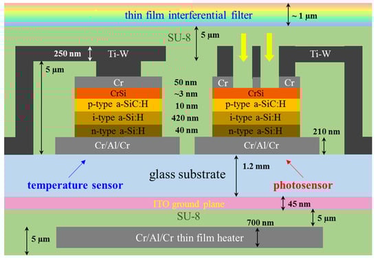 Thanks to the design optimization of the system, all the integrated sensors and actuators can operate simultaneously without loosing in performances. In particular, temperature sensors and photodiodes are fabricated in the same deposition run; for this reason, the thicknesses of the p-i-n junction layers have been optimized to have both high sensitivity to light and good linearity and stability when the diodes are used as temperature sensors []. Furthermore, as it can be noted in the cross-section of Figure 3, only the top contact differs for these kind of sensors. In particular, for the photosensors, it consists in a Cr/Al/Cr metal grid realized over a thin transparent layer of chromium silicide, which is autonomously formed when the chromium is deposited on the n-doped amorphous silicon []. This configuration allows the light radiation to reach the intrinsic layer, where the electron-hole pair can be photogenerated. On the other hand, for the temperature sensors, the top contact is a uniform metal layer able to shield the light radiation, which must not affect the temperature measurements. In addition to the different configuration of the top contact, also a transparent ground plane has been integrated for uncoupling the heater leakage currents from the sensors, leaving intact their sensitivity and, therefore, the system limit of detection also when heater and sensors are used at the same time.
