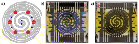 The microfluidic chip can be developed by using different materials, including glass [], Cyclic Olefin Copolymers (COC) [], or Polydimethylsiloxane (PDMS) []. A picture of the system coupled with a simple black-PDMS six-wells microfluidic chip (Figure 9a) sticked on a 3 cm × 3 cm 200 µm-thick glass substrate is shown in Figure 10, where a 3D-printed holder has been positioned on the top of the SoG to guarantee optical and thermal coupling between the LoC and the microfluidics.