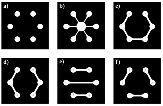 Possible shapes of the microfluidic chip: (a) six separated wells; (b) configuration including a central load-lock chamber connected to six detection areas; (c) microfluidic channel connecting all detection sites; (d) two channels configuration; (e,f) three channel configurations.