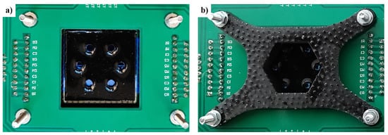 The developed connector is composed by two parts, a top and a bottom PCBs. The bottom one integrates two 20-pad connectors for the heater contacts and it is used also to sustain the SoG. On the other hand, the top PCB includes another two 20-pad connectors for the SoG sensors contacts and two supplementary 12-pad connectors suitable to drive optional electrodes. These ones have to be integrated on a 3 cm × 5 cm top substrate, positioned on the top of the LoC as shown in Figure 5. This configuration allows to integrate other sensors and/or actuators to the platform, making feasible the driving, for example, of sensors to monitor conductibility [,] or pH [], electrodes for digital microfluidic [,] or electrochemical analysis [].