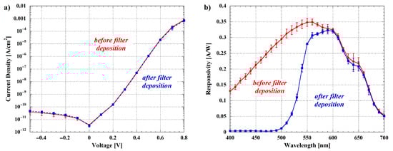 - Nikolaidou, K.; Condelipes, P.G.; Caneira, C.R.; Krack, M.; Fontes, P.M.; Oliveira, H.M.; Kovačič, M.; Krč, J.; Topič, M.; Cardoso, S.; et al. Monolithically integrated optical interference and absorption filters on thin film amorphous silicon photosensors for biological detection. Sensors Actuators B Chem. 2022, 356, 131330. [Google Scholar] [CrossRef]
