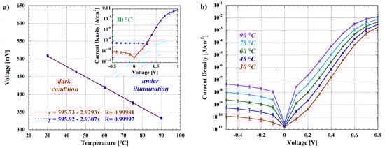 Moreover, all the below reported measurements refer to a stable behavior of the sensors. Indeed, the optoelectronic characterizations performed on “as grown” temperature and light amorphous silicon sensors show that each sensor modifies its characteristics for repeated measurements and thermal cycles. However, these changes decrease with increasing use and, for this reason, all the reported measurements have been carried out after a few days during which the optoelectronic platform is stressed with continuous thermal cycles. After this treatment, the sensors result stable, since the differences between repeated measurements of the same sensor is less than 1% without showing a monotonic trend.