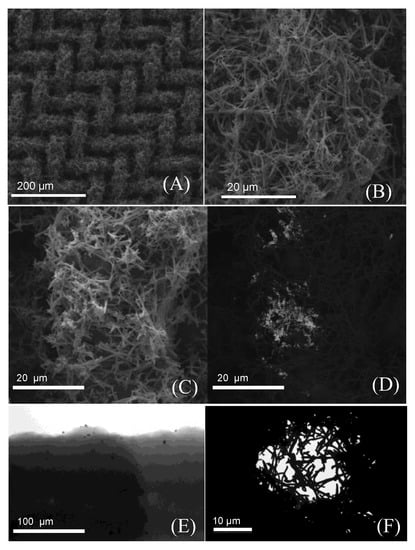 Representative SEM images from the steel mesh coverage: (A,B) closer approximation of a wire mesh, (C) the wire-mesh image of secondary electrons of the hybrid PPy/AuNPs, and (D) the SEM with backscattered electrons. (E,F) TEM representative images from a single nanotube and a small gap in between the steel mash, respectively.